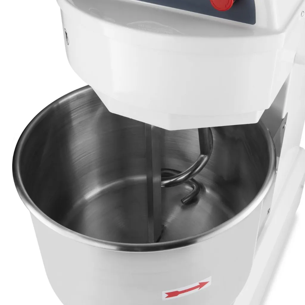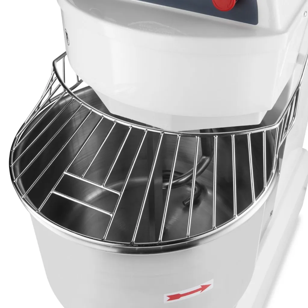 El motor de esta amasadora es potente pero silencioso para que pueda amasar grandes porciones de masa sin molestar al personal. Puede elegir entre dos velocidades: 120 y 240 RPM. Puede seleccionar la velocidad deseada con los botones de fácil uso para lenta y rápida. Además, esta amasadora es segura para trabajar. El interruptor de seguridad evita que el motor se sobrecaliente y apaga la máquina en cuanto esto ocurre. Además, el bol de mezcla tiene una jaula de protección que debe cerrarse antes de que el aparato se ponga en marcha. De esta forma, evita que caigan objetos en el bol durante el uso y que se produzcan accidentes. La amasadora también está equipada con un botón de arranque y una parada de emergencia. La transmisión por correa garantiza una mayor vida útil de la amasadora.