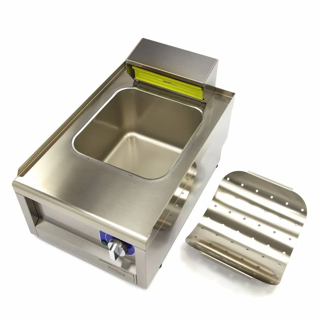 Si está friendo intensamente en la cocina profesional, este calentador es indispensable. Puede colocar fácilmente la unidad de calentamiento sobre una mesa o una encimera, pero para freír de forma realmente eficaz, coloque la unidad en una línea de cocción. El falso fondo está perforado y tiene una forma que facilita la recogida de las patatas fritas.