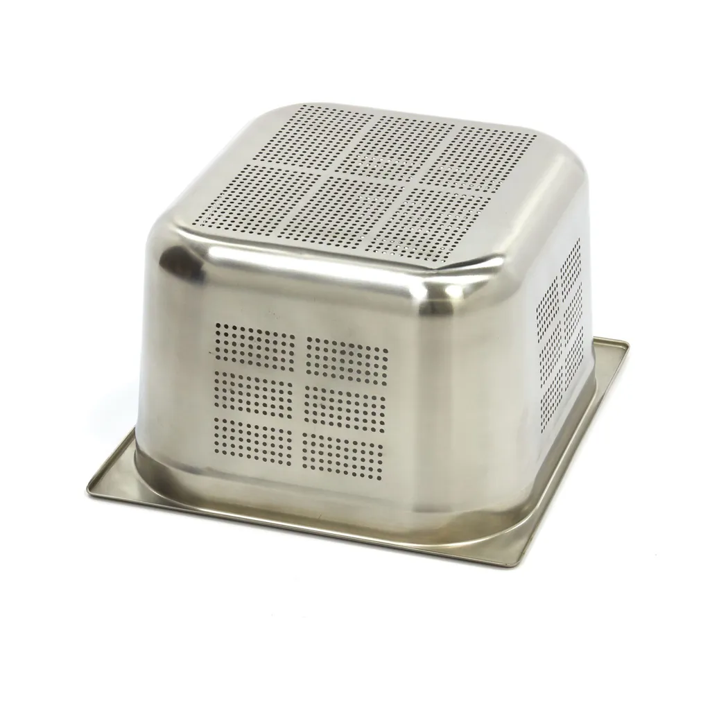 Para dotar al contenedor GN de una mayor solidez, cuenta con bordes doblados y esquinas redondeadas. Además, el contenedor Gastronorm perforado es seguro y se puede apilar de forma excelente. Esto permite ahorrar un valioso espacio en la despensa, el frigorífico y el congelador. También es bueno saber que el contenedor GN cumple los requisitos europeos de seguridad alimentaria. Gracias a los pequeños agujeros del fondo y de los laterales, puede utilizar el recipiente para escurrir verduras y otros alimentos.