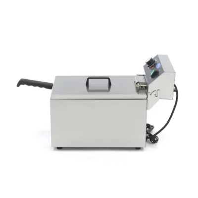 Trabajar con seguridad es muy importante en el sector de la restauración, especialmente cuando se fríen productos a temperaturas de hasta 200°C. Por eso esta freidora profesional viene con una tapa extraíble. Durante la fritura, puede cerrar la freidora para evitar salpicaduras de aceite. El mango de la cesta de freír y la tapa son resistentes al calor por motivos de seguridad. Además, una colocación estable que evite el desplazamiento de la freidora aumenta la garantía de seguridad, por lo que se incluyen patas de goma en esta freidora. Esta freidora grande es ideal para freír grandes cantidades o para ampliar la capacidad de fritura de su cocina. Durante la fritura, las migas suelen caer al fondo y quemarse, pero gracias a la zona fría incorporada, el aceite situado debajo de la resistencia se calienta menos, evitando que esto ocurra. Como resultado, el aceite dura más y no es necesario cambiarlo tan a menudo.