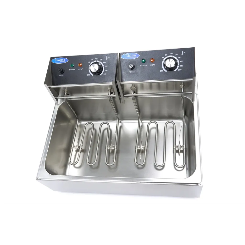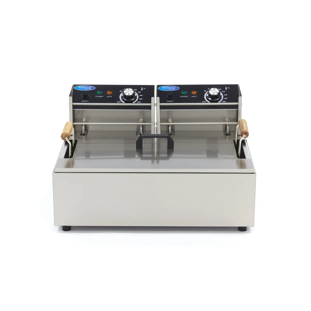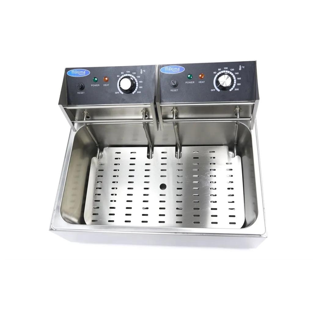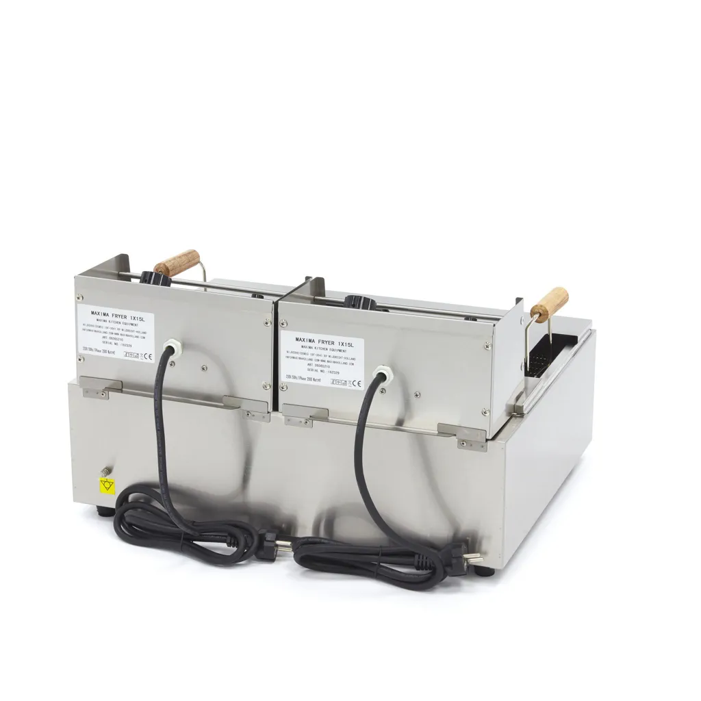 Si fríe regularmente grandes cantidades de alimentos en su establecimiento de restauración, esta freidora profesional con una capacidad de 15 litros es ideal. Consta de dos elementos calefactores independientes y una gran cesta para freír. La ventaja de una freidora con dos elementos calefactores es que no necesita mucha potencia. Así que no importa en qué tipo de cocina se encuentre, la freidora puede conectarse simplemente a una toma de corriente estándar. Al levantar la cesta de freír, puede utilizar las asas resistentes al calor para evitar lesiones, y la tapa suministrada evita que el aceite salpique durante el uso. Las patas de goma de la parte inferior del aparato garantizan su estabilidad y firmeza en la mayoría de las superficies.