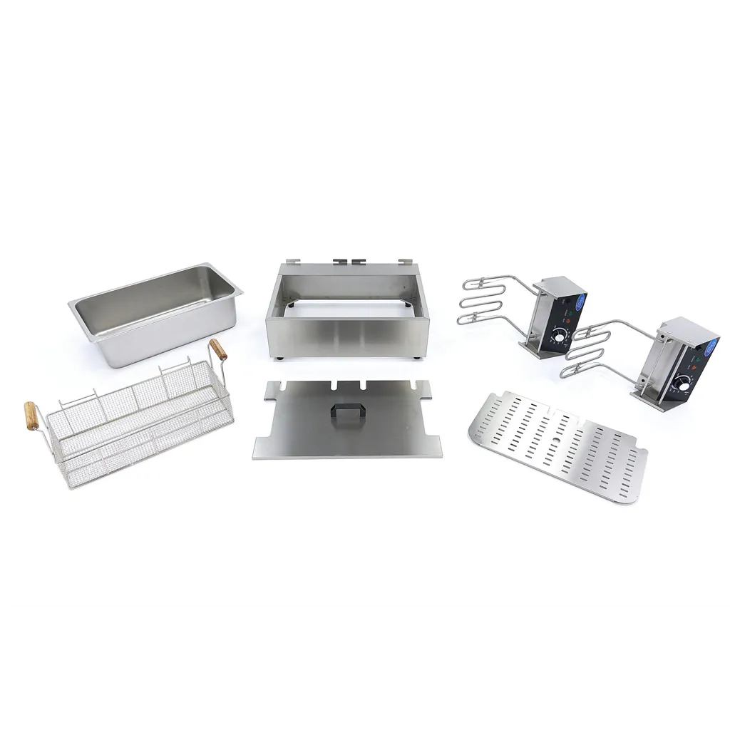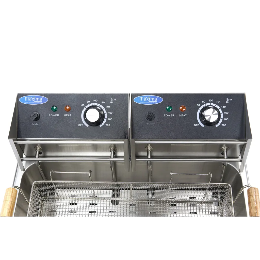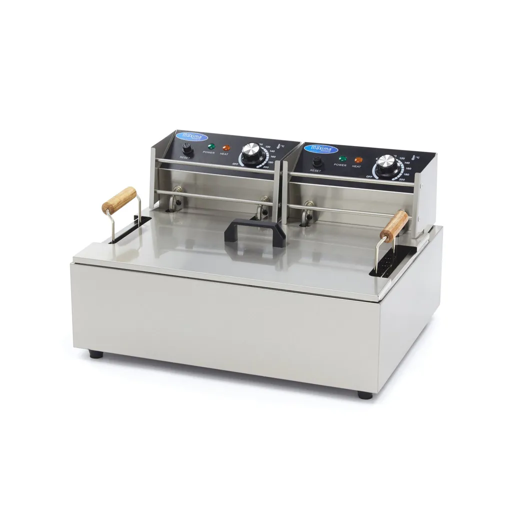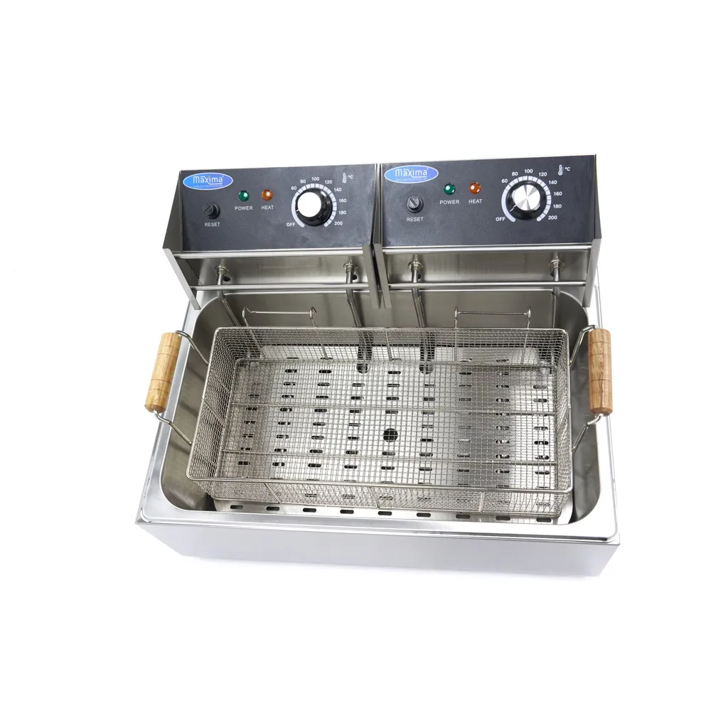 Si fríe regularmente grandes cantidades de alimentos en su establecimiento de restauración, esta freidora profesional con una capacidad de 15 litros es ideal. Consta de dos elementos calefactores independientes y una gran cesta para freír. La ventaja de una freidora con dos elementos calefactores es que no necesita mucha potencia. Así que no importa en qué tipo de cocina se encuentre, la freidora puede conectarse simplemente a una toma de corriente estándar. Al levantar la cesta de freír, puede utilizar las asas resistentes al calor para evitar lesiones, y la tapa suministrada evita que el aceite salpique durante el uso. Las patas de goma de la parte inferior del aparato garantizan su estabilidad y firmeza en la mayoría de las superficies.