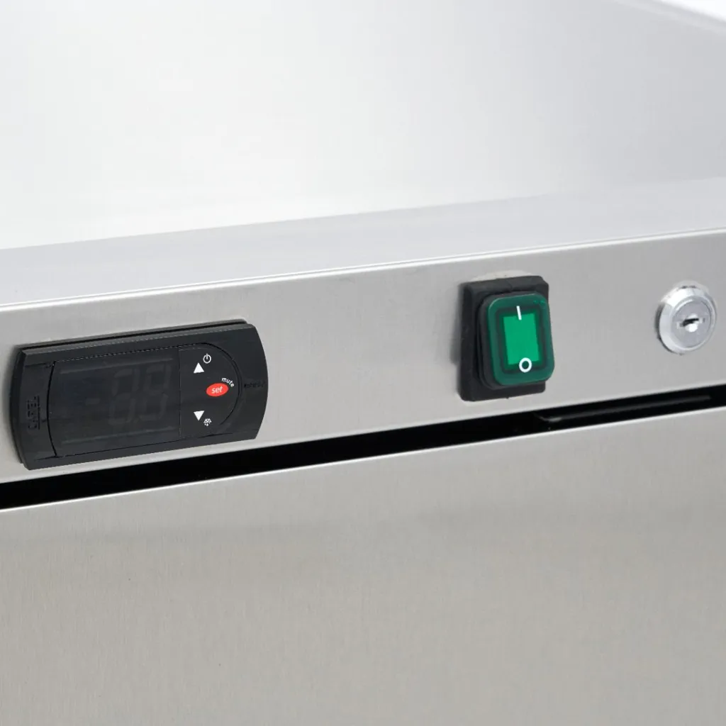 Cuando se trabaja con ingredientes frescos, es importante disponer de un frigorífico que lo mantenga todo refrigerado el mayor tiempo posible. Este frigorífico profesional de acero inoxidable tiene una capacidad bruta de 200L y está equipado con tres estantes ajustables. Esto le permite elegir la mejor disposición en función de sus necesidades. También ofrece la flexibilidad de ampliar el número de estantes para obtener compartimentos adicionales. La puerta incluye cerradura para mayor comodidad.