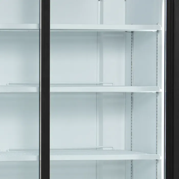 Este modelo es estándar con exterior e interior blancos. Incluye 5 estantes de rejilla blancos ajustables y 2 puertas de cristal deslizantes de cierre automático.