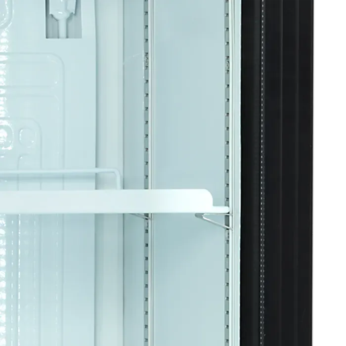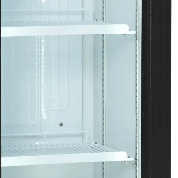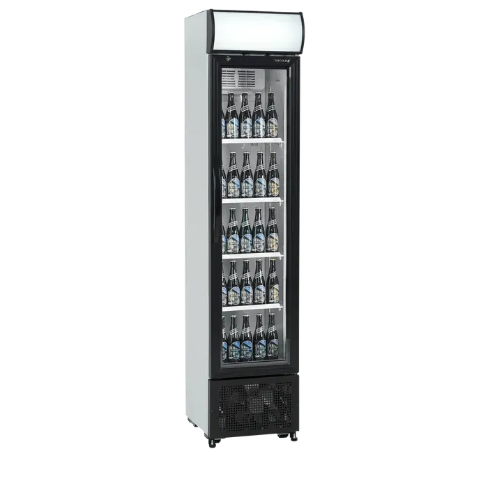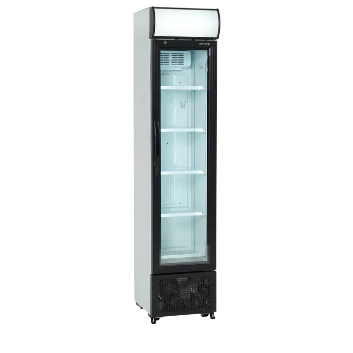 Nuestro esbelto refrigerador solo mide 435mm de ancho. Es un enfriador de botellas con puerta de cristal ideal cuando el espacio es limitado pero se desea maximizar las ventas.