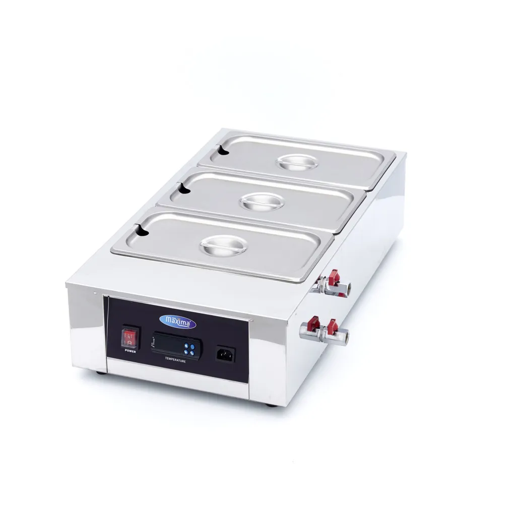 Equipado con 3 recipientes de 1/3 GN con una profundidad de 10 cm, podrá fundir chocolate rápida y fácilmente sin que se queme. Este fundidor de chocolate funciona según el principio del baño maría, lo que significa que el agua caliente garantiza que el chocolate se derrita uniformemente.