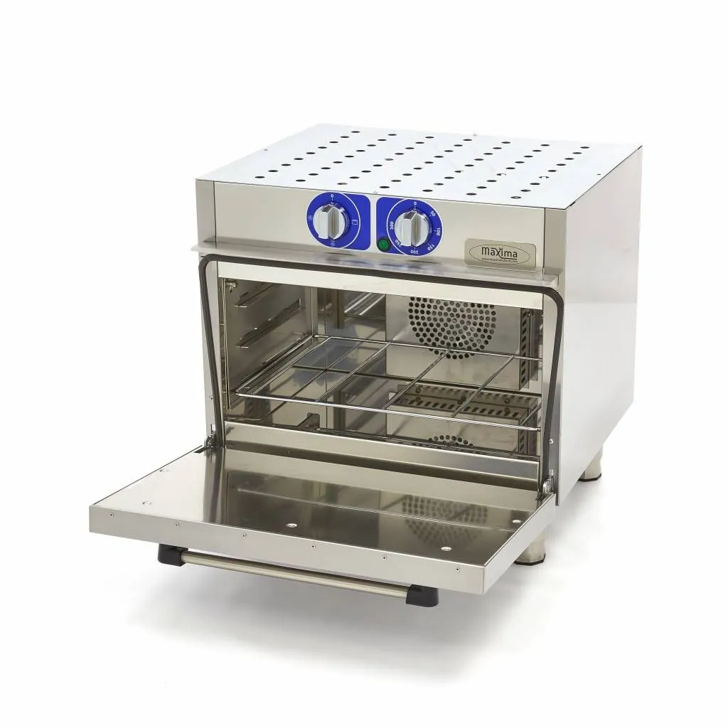 La temperatura de este horno profesional puede ajustarse entre 50 y 300ºC. En la cámara interior, encontrará una resistencia en la parte superior y en la parte posterior. El horno también dispone de un ventilador turbo para que el aire caliente se distribuya uniformemente en el horno. Para un buen aislamiento, el horno está equipado con una gruesa puerta de acero inoxidable de 4 cm. La cámara del horno es completamente de acero inoxidable y tiene tres estantes para bandejas. Un estante con una dimensión de 53 x 34cm viene de serie. Puede utilizar este horno en combinación con bandejas 1/1 GN.