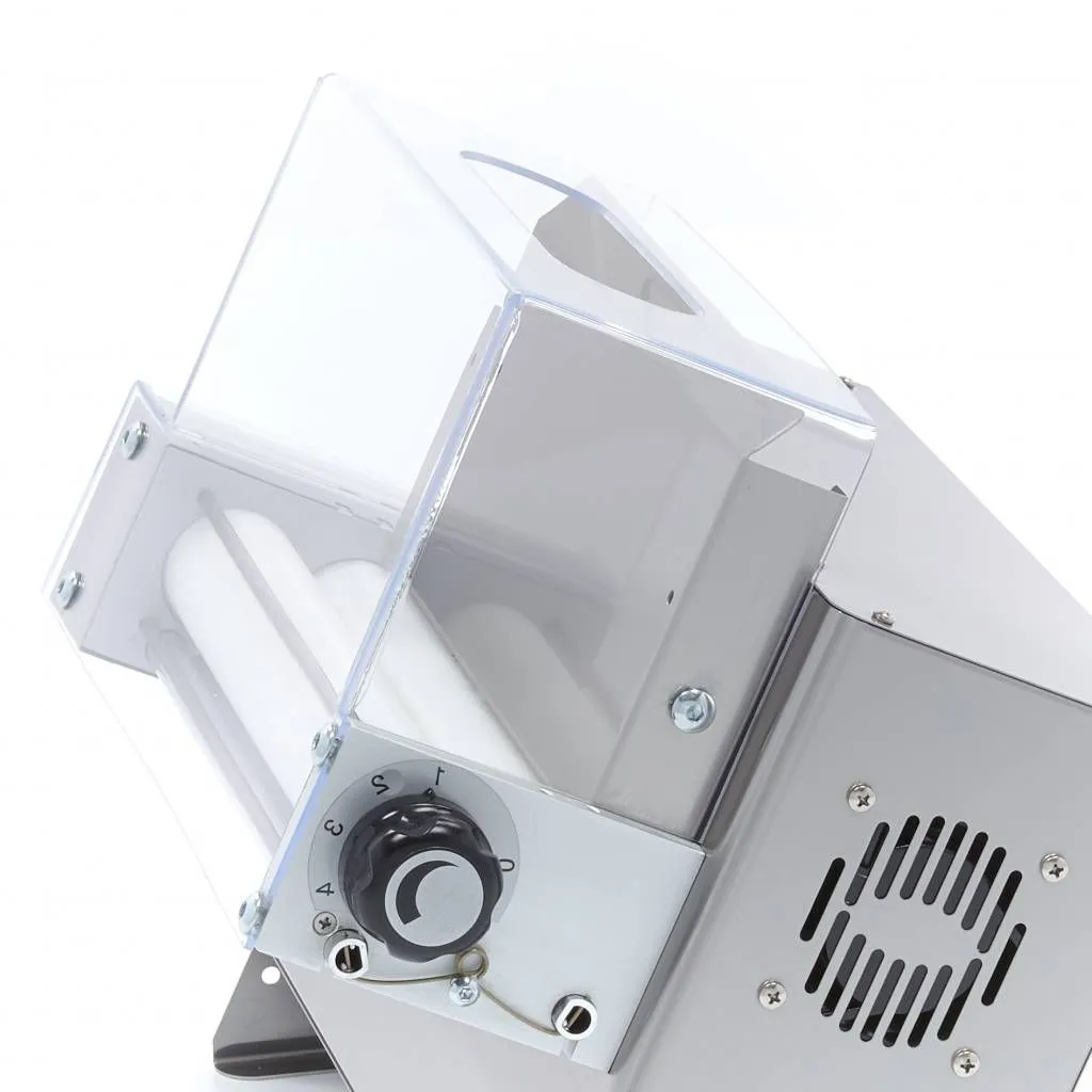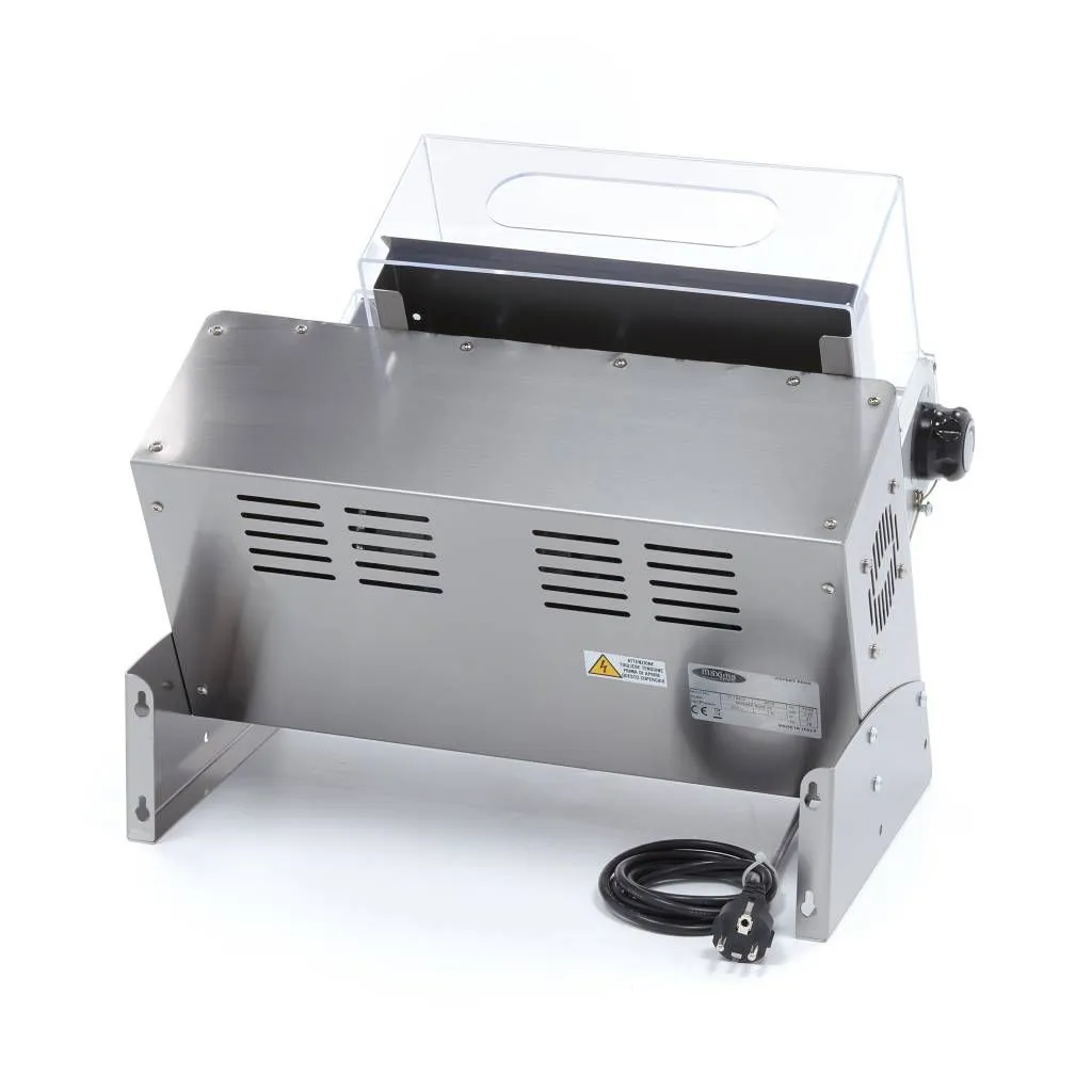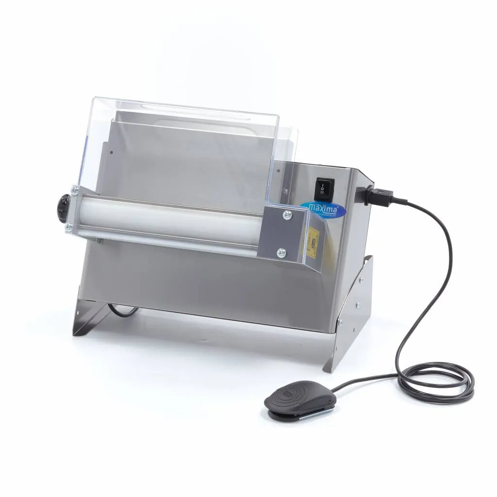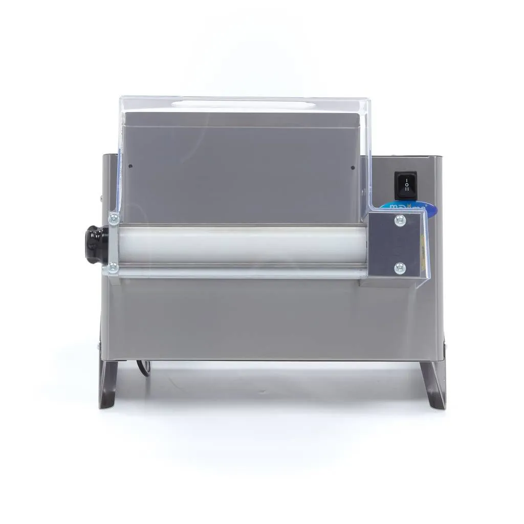 Este rodillo de fondant individual está equipado con un motor duradero y potente. El rodillo para fondant está provisto de una velocidad. Para trabajar con seguridad con este rodillo para fondant, tiene una cubierta protectora de plástico transparente y un interruptor de seguridad. Las dos anchas patas de acero inoxidable proporcionan una buena estabilidad. La carcasa está hecha completamente de acero inoxidable y es muy fácil de limpiar. Puede extraer las distintas piezas del aparato y limpiarlas con un paño seco. No utilice agua, ya que los restos de harina podrían adherirse al aparato.