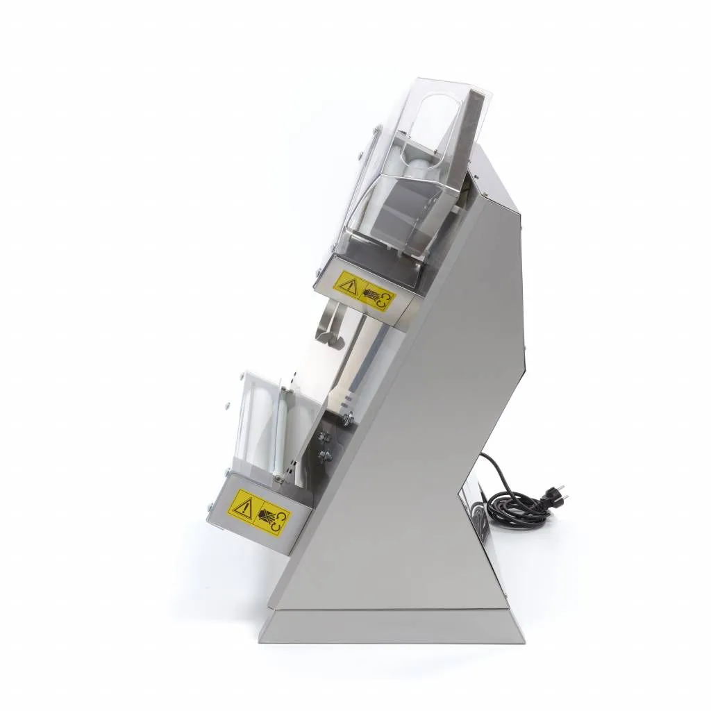 El rodillo profesional se pone en marcha automáticamente mediante un sensor. En cuanto se coloca la masa en la máquina, el sensor lo detecta y pone en marcha el rodillo. Puede ajustar el tiempo de funcionamiento entre 10 y 35 segundos. Una vez transcurrido el tiempo, el aparato se detiene automáticamente. Esto ahorra tiempo y energía, y reduce el desgaste de los componentes. Antes de colocar la masa en el aparato, debe espolvorearla con harina para evitar que la masa se pegue al rodillo. El rodillo dispone de dos puntas para extender fondos redondos y tiene dos ajustes.