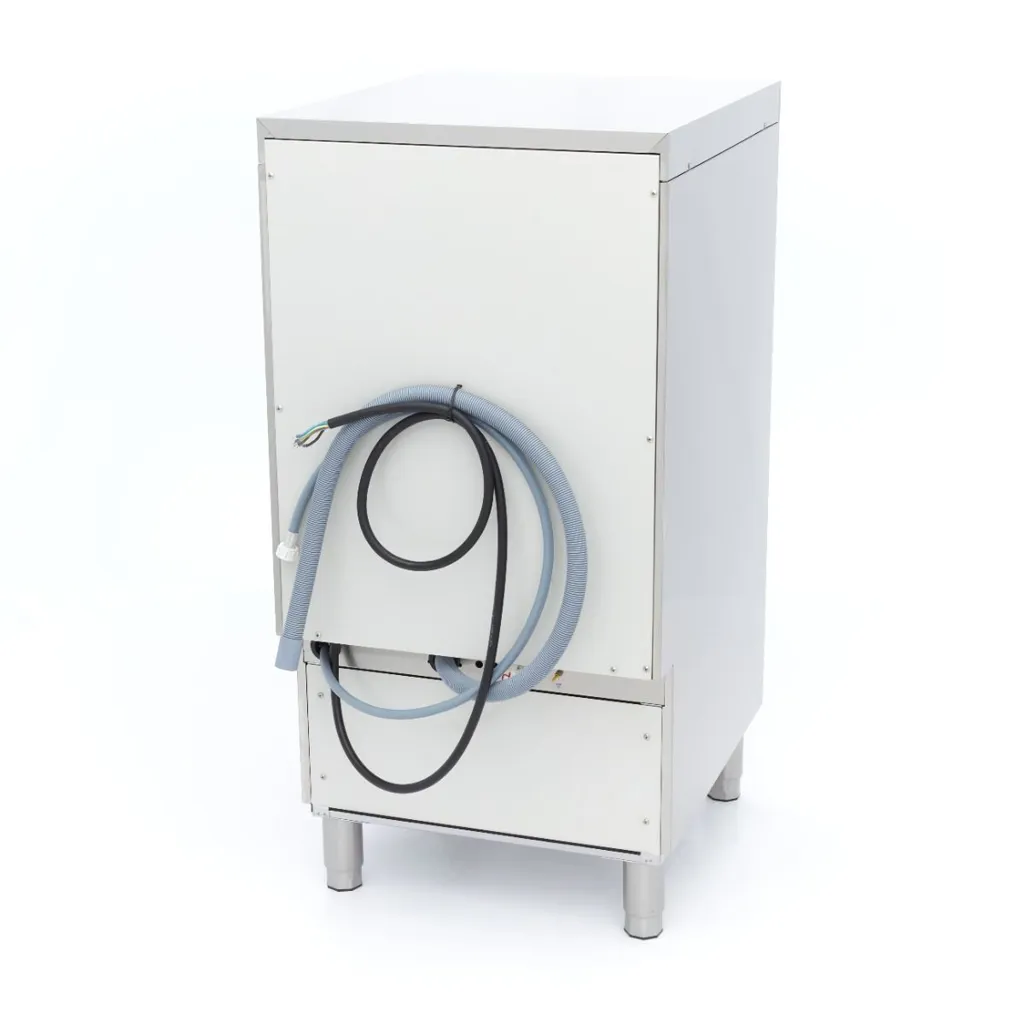La puesta en marcha de este lavavajillas profesional es muy sencilla. A través del panel de control, con protección IPX4 para que el agua no penetre detrás de los botones, sólo tiene que encender el lavavajillas y el agua se llenará y calentará automáticamente. Con el segundo botón se programa el programa de lavado. Las ollas y sartenes se lavan a una temperatura de 60°C y luego se aclaran con agua caliente a 80°C, para que la vajilla vuelva a secarse rápidamente por evaporación.