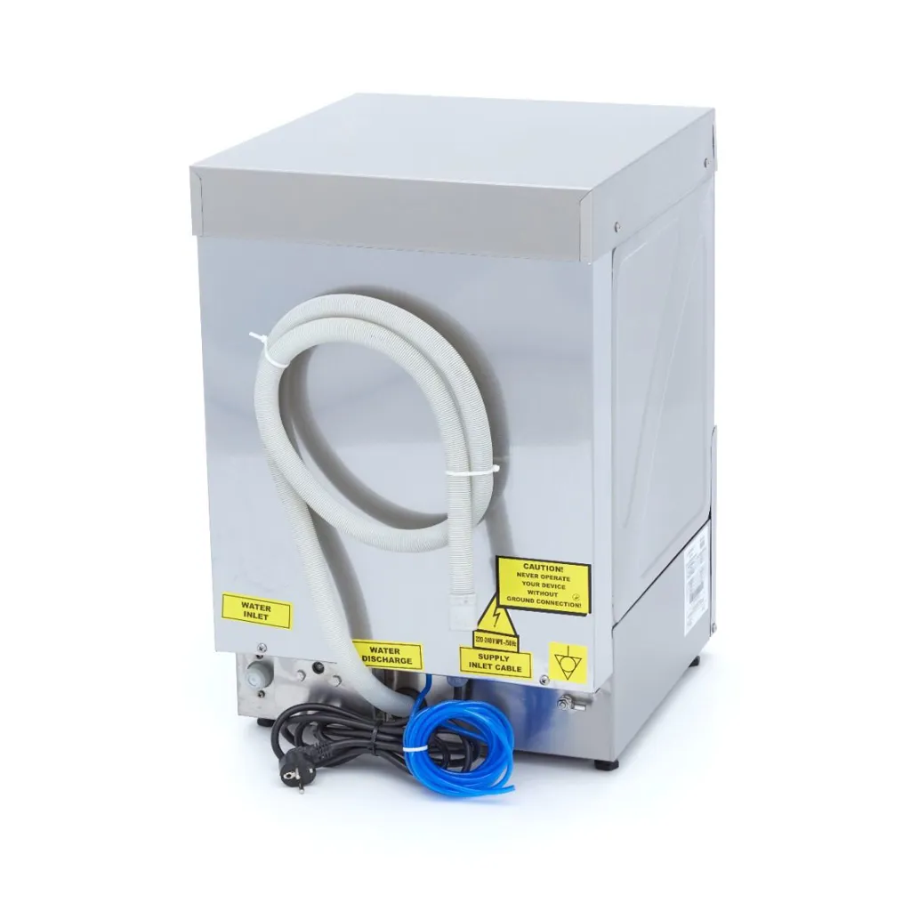This glass washer is highly economical, consuming only 2,5L of water per cycle. It offers safety features such as thermal protection and IPX5 protection for the control panel. It’s also easy to operate the machine with a single button for water filling and heating in the boiler tank. The digital pressure switch for the washing tank allows easy adjustment of the water level, while the NTC sensor controls the thermostat. The glasses are washed at 55-60°C and rinsed at 80-85°C, resulting in faster drying. You can choose to preheat the water or start with cold washing. Four indicator lights show the status of filling, heating, washing and programme durations. The glass washer makes a sound once the cycle is finished. It comes with a 35 x 35cm glass basket, a plate rack insert, a cutlery basket and a supply and drain hose for connecting to the water supply. The dishwasher also includes a rinse pump. Four adjustable feet allow for easy height customisation.