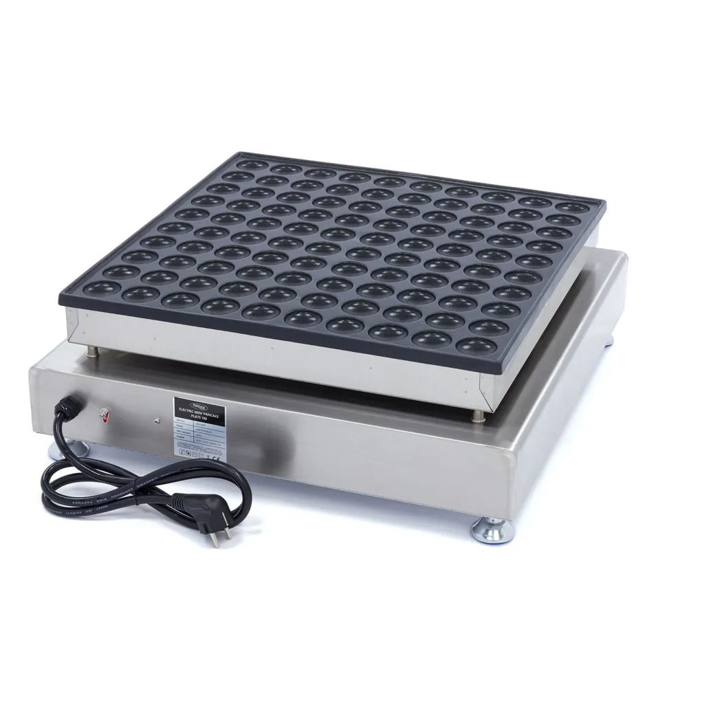 Para preparar rápidamente deliciosas mini tortitas, ponga esta minipanquequera eléctrica en su cocina. Puede hacer hasta 100 mini tortitas a la vez y, gracias a la buena conducción del calor, puede ponerse en marcha rápidamente. Esta mini panquequera profesional es ideal para utilizarla en puestos de pasteles antiguos, food trucks y en mercados y ferias. La mini panquequera tiene una placa de cocción de aluminio con revestimiento antiadherente para que las tortitas se desprendan fácilmente de la placa