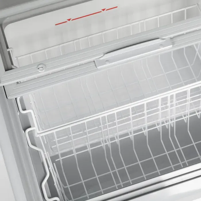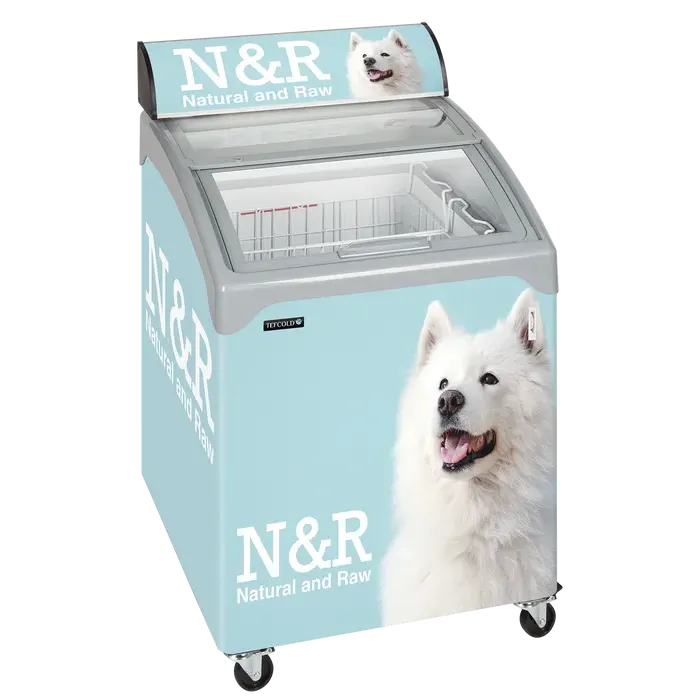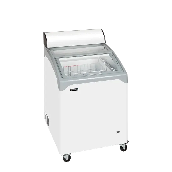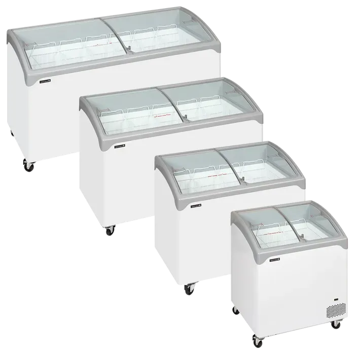 Este congelador es un compacto congelador horizontal de exposición con un diseño elegante. Cuenta con esquinas y bordes redondeados y tapas deslizantes de cristal curvas.