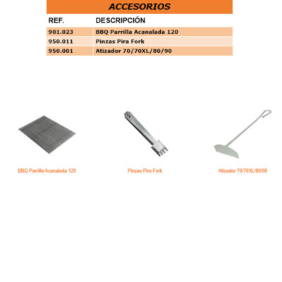 INCLUYE: 1 pinzas tenedor, 1 atizador y 2 parrillas acanaladas.