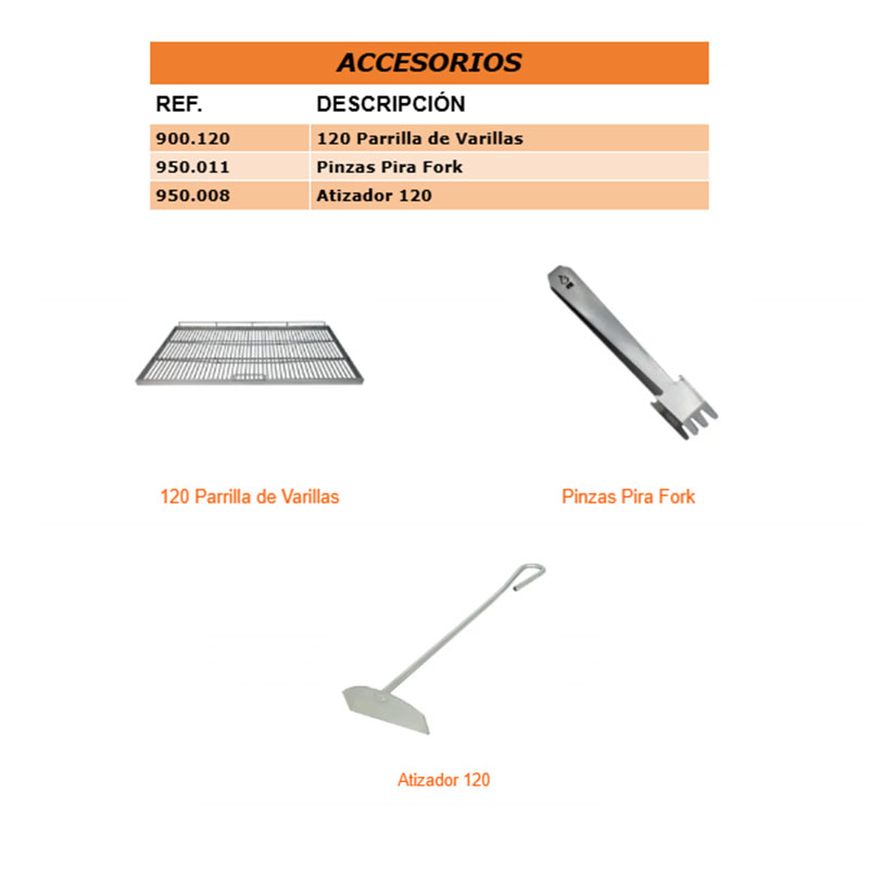 INCLUYE: Pinza tenedor, atizador y 1 parrilla de varilla con medidas 106,2 x 62,5 cm.