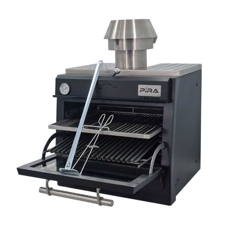 Se pueden cocinar todo tipo de alimentos: pescado, verduras, etc. El Pira 70 BLACK está equipado con un cristal que soporta altas temperaturas, hasta 750ºC permitiendo ver los alimentos durante la cocción, lo que ayuda de nuevo a mantener la temperatura y reducir el consumo de carbón.