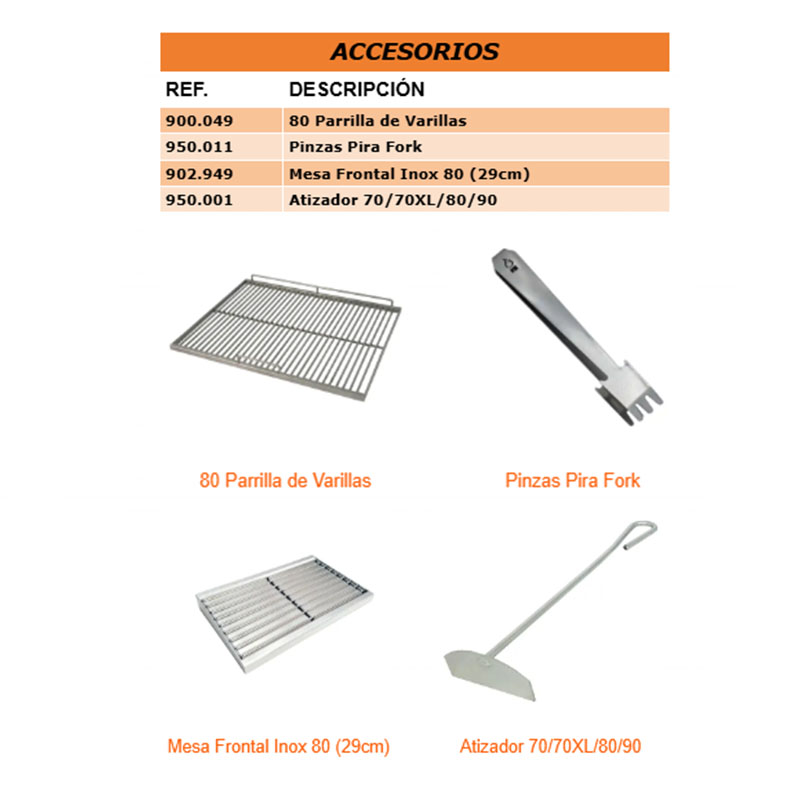 INCLUYE: Pinza tenedor, atizador, mesa frontal y 1 parrilla de varilla con medidas 66,8 x 53,5 cm.