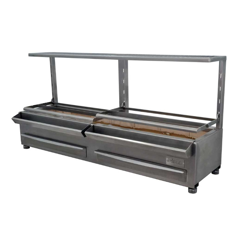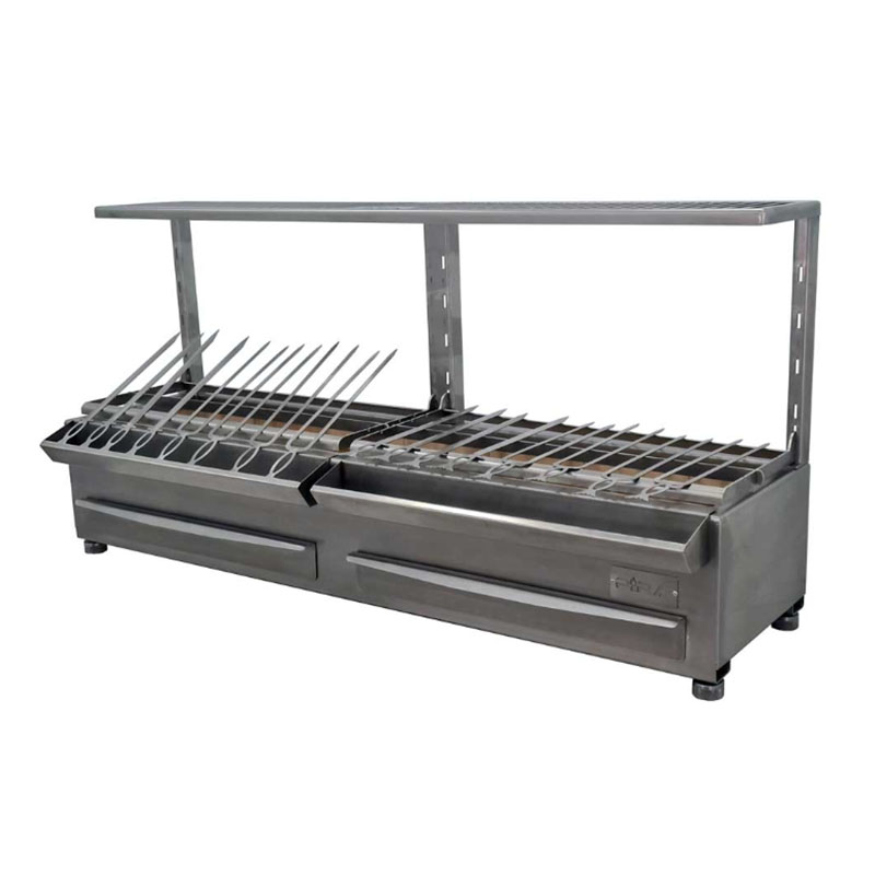Los aparatos están dotados de una columna con múltiples posiciones para regular la altura de las parrillas, facilitando el control del braseado. El estante superior permite mantener las brochetas calientes o atemperar los productos antes de su cocción.