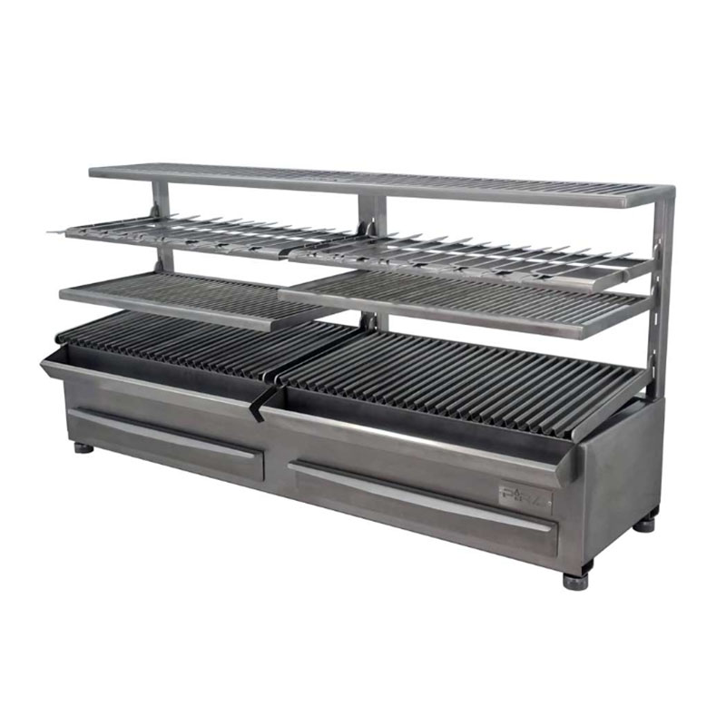 El soporte para pinchos tiene una barra longitudinal que puede ajustarse para utilizar distintas medidas de brochetas, a gusto del cliente. Las parrillas acanaladas y de varilla también están disponibles.
