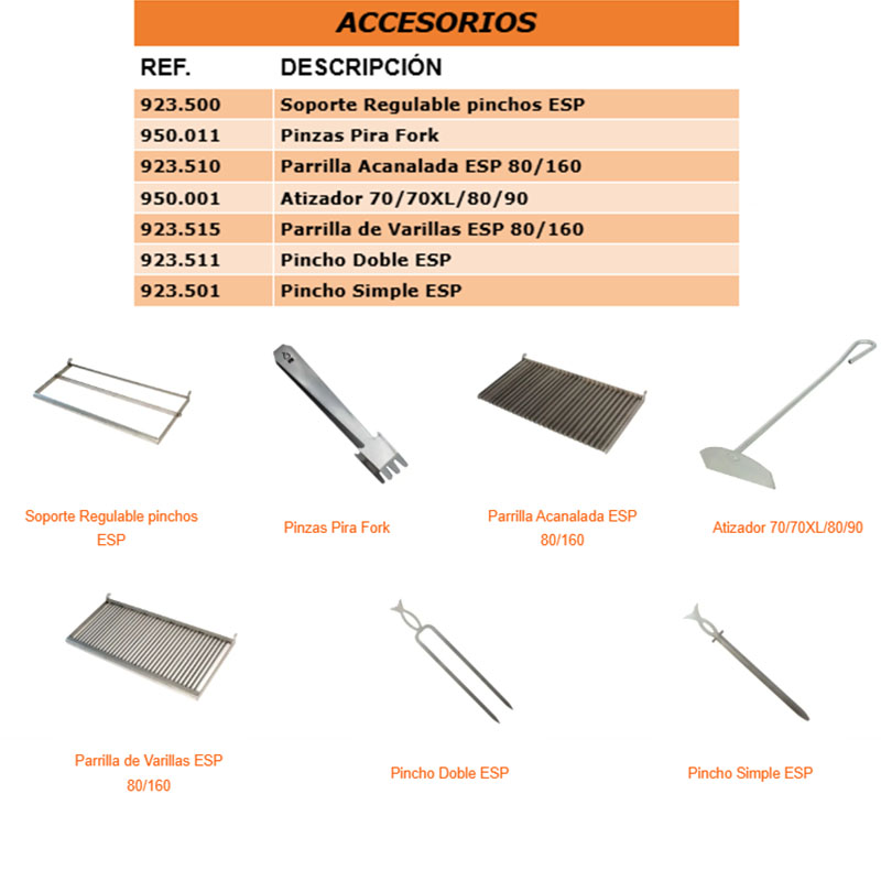 INCLUYE: 1 atizador, 1 pinzas tenedor, 2 soportes para pinchos, 2 parrillas, 8 pinchos simples y 8 pinchos dobles.