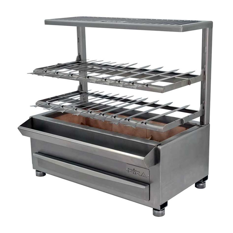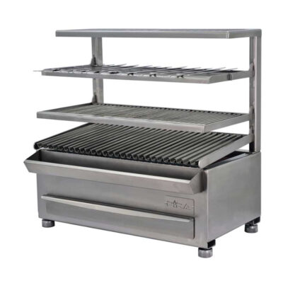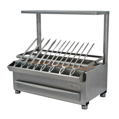 Los aparatos están dotados de una columna con múltiples posiciones para regular la altura de las parrillas, facilitando el control del braseado. El estante superior permite mantener las brochetas calientes o atemperar los productos antes de su cocción.