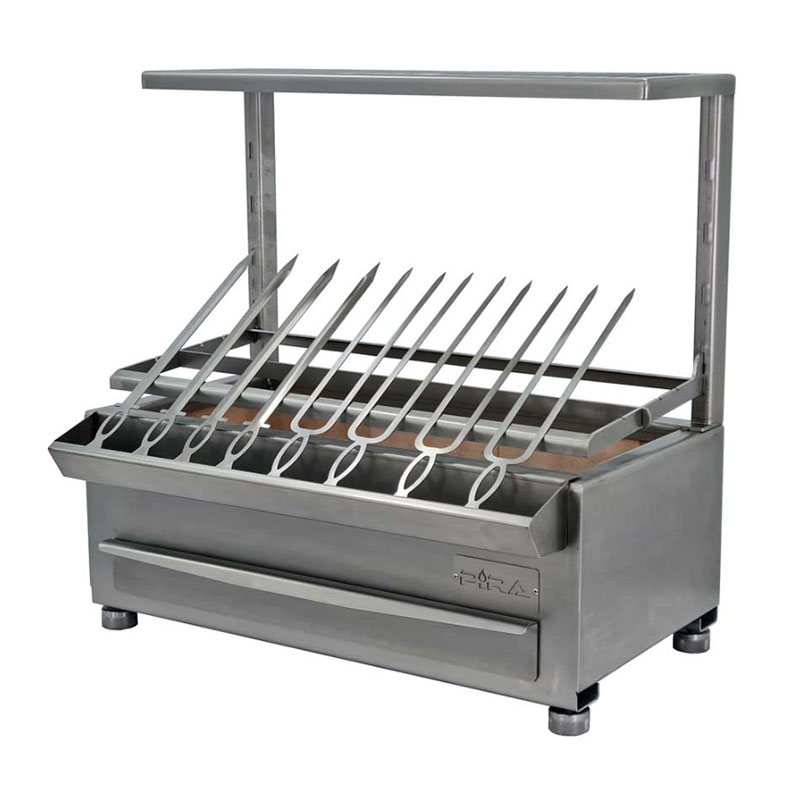El soporte para pinchos tiene una barra longitudinal que puede ajustarse para utilizar distintas medidas de brochetas, a gusto del cliente. Las parrillas acanaladas y de varilla también están disponibles.