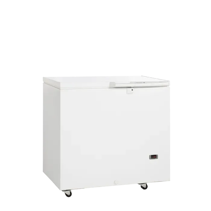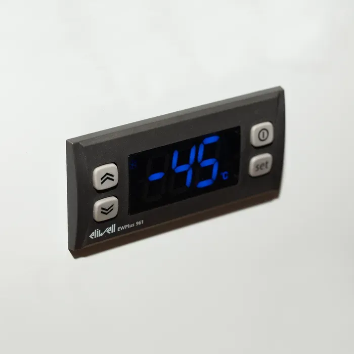 Diseñado para congelar a muy baja temperatura: -45ºC. Termostato electrónico con alarma. Drenaje del agua de desescarche.