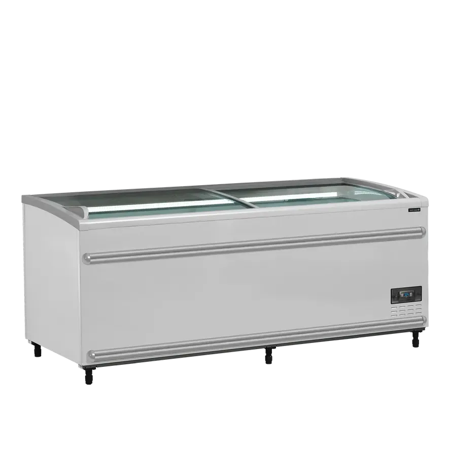El refrigerador/congelador es perfecto para la exposición de productos en supermercados, tiendas de comestibles, carnicerías, tiendas de alimentación para mascotas, etc. Las tapas de cristal curvas deslizantes ofrecen una visibilidad completa de los productos contenidos en el interior.