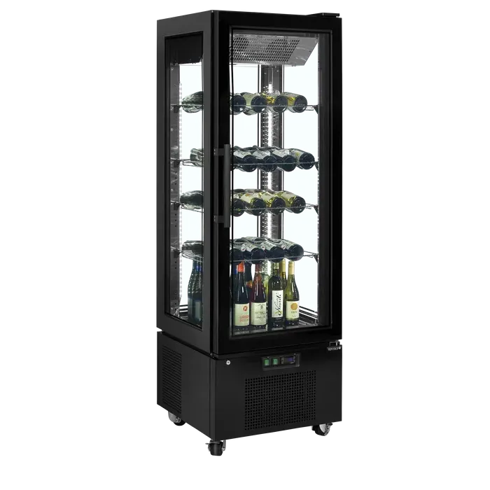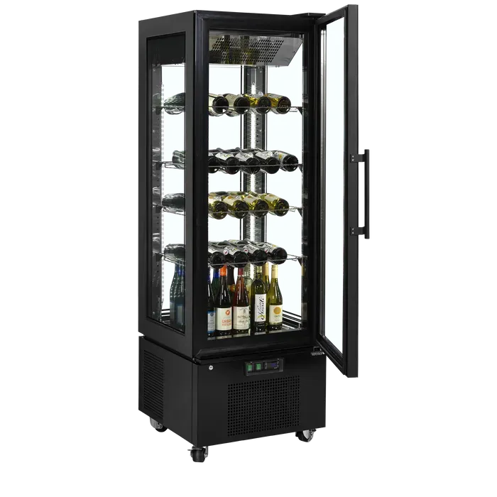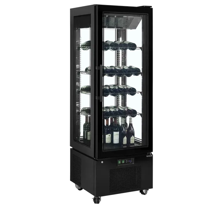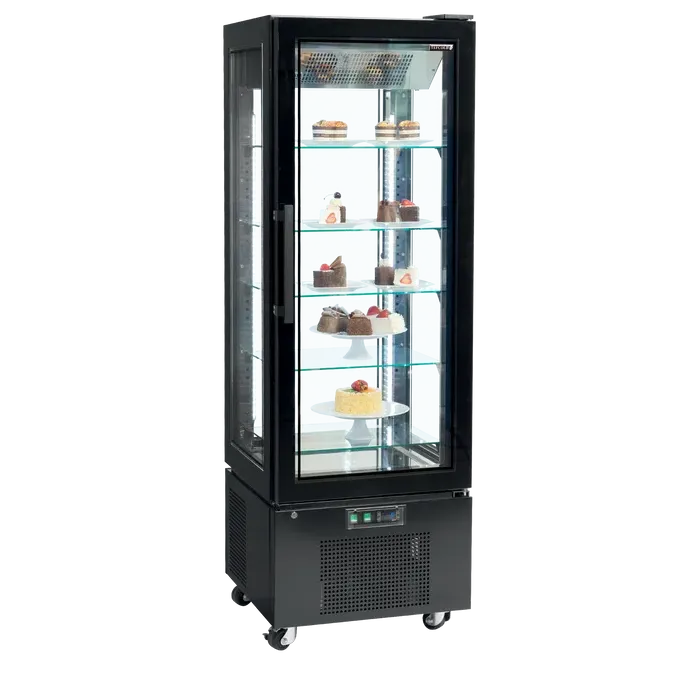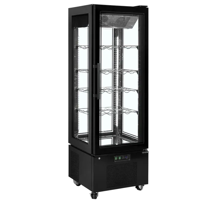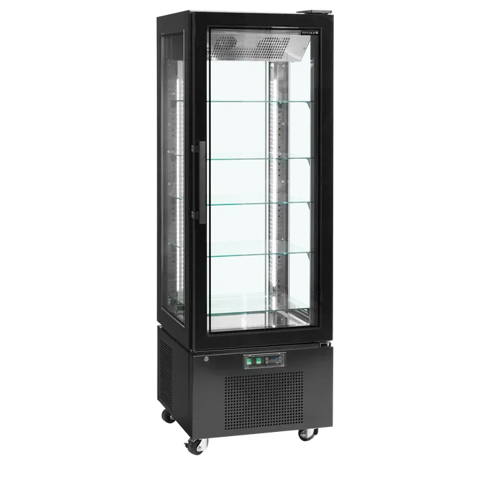 Ofrece una excelente presentación de producto con doble acristalamiento en los cuatro lados, incluida una puerta de cristal sin marco. Este armario de cristal refrigerado constituye una opción elegante para exponer deliciosas tartas y postres, pero también es apropiado para exponer vinos (estantes para botellas de vino disponibles como opción).