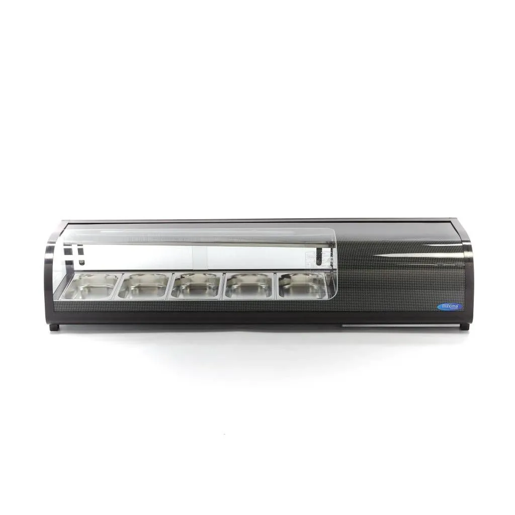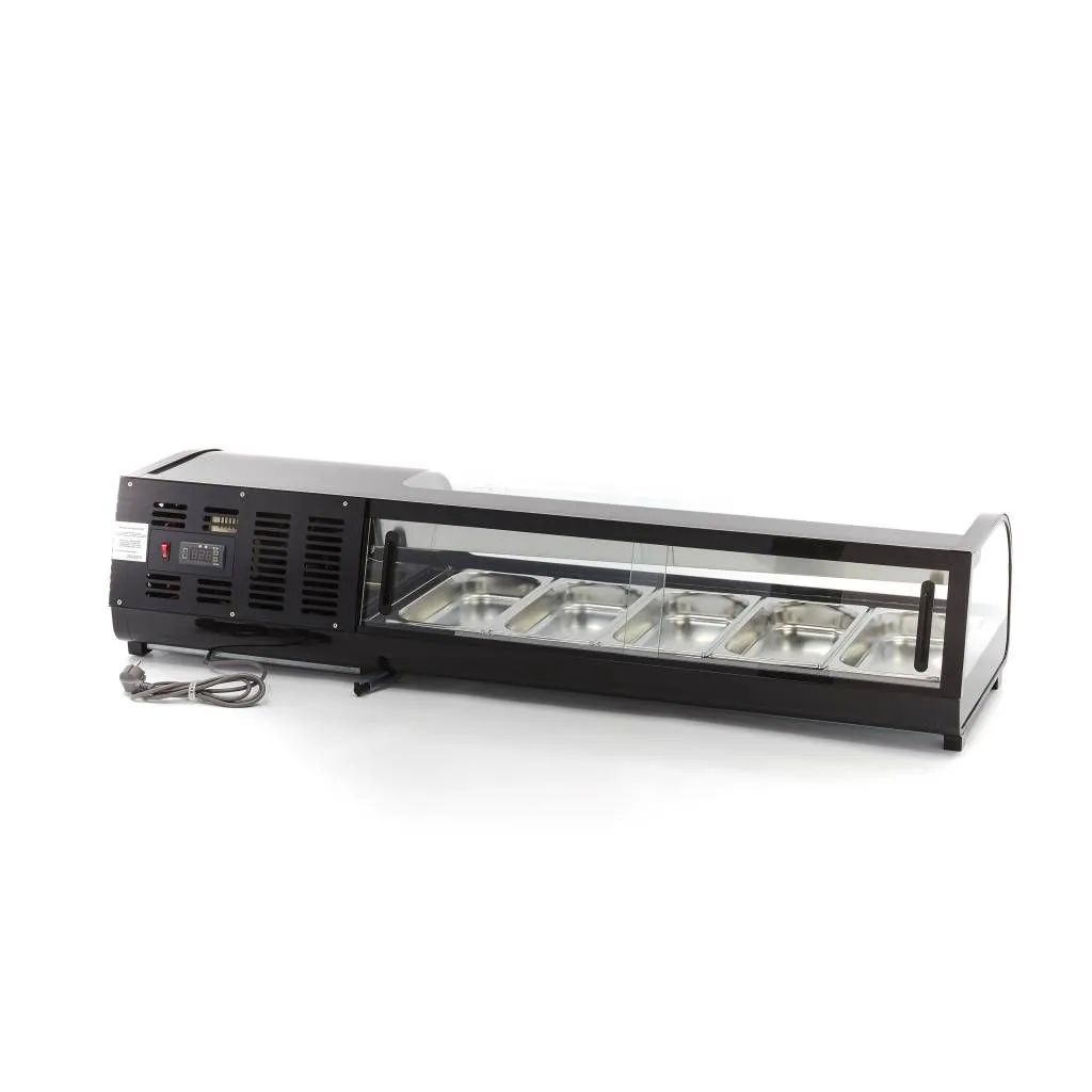 Esta vitrina de tapas es adecuada tanto para presentar alimentos como para mantener frescos los productos pequeños. El cristal curvado y la carcasa negra dan a esta vitrina un aspecto lujoso y elegante. Es ideal para colocarla en un mostrador para que esté a la vista de sus invitados. La vitrina de tapas es adecuada para presentar tapas, pero también para mantener fríos los platos de sushi y los productos de pescado. Esta vitrina de tapas profesional puede utilizarse en combinación con los contenedores GN. Esta vitrina de sushi se suministra de forma estándar con 5 bandejas GN de 1/3.