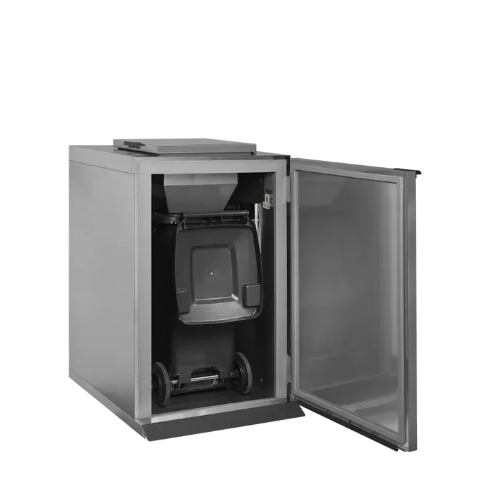 Este refrigerador tiene capacidad para un contenedor de residuos de 120 l o 240 l (no incluido). Una tapa en la parte superior facilita el acceso para eliminar los residuos. La tapa cuenta con una junta magnética que garantiza un cierre eficaz y evita la contaminación de las zonas circundantes. El refrigerador de residuos dispone de una rampa para extraer y volver a introducir fácilmente el contenedor cuando toca vaciarlo.